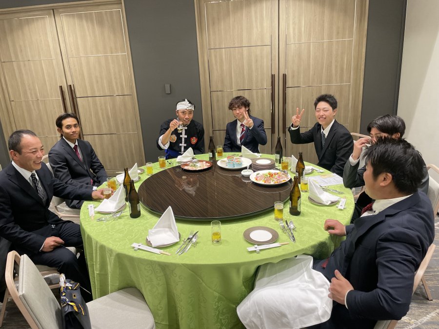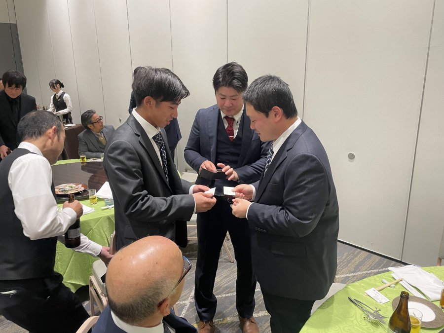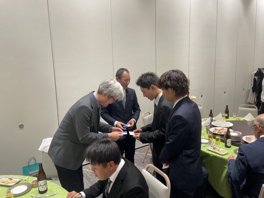 社会人としての印象を大きく左右する大切な挨拶、名刺交換。新入社員たちは入社時研修会で練習はしたものの、普段はなかなか実践する機会がありませんでしたが、この場をお借りして、お一人お一人とご挨拶をさせていただきました。ご来賓の皆様、お付き合いいただきありがとうございました。